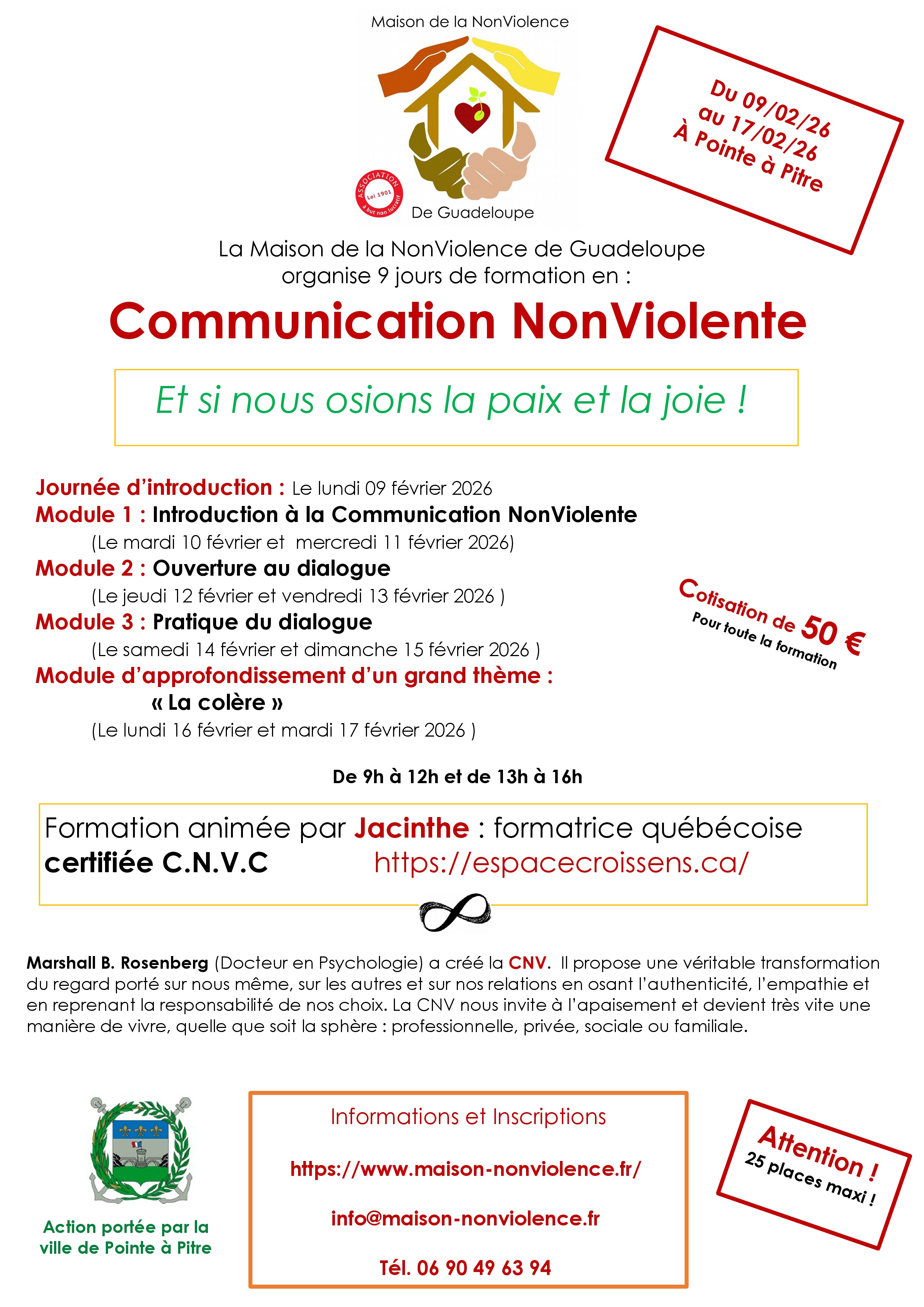 Coût : 50€ / personne, d’adhésion à la Maison de la NonViolence de Guadeloupe